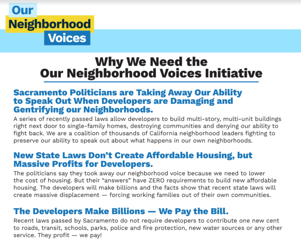 If you are a local elected official and would like to have your city or county demonstrate its support by passing a resolution in support of our initiative, a sample resolution is provided here. When your council or board has passed a version of it, please notify us by returning it to info@ourneighborhoodvoices.com